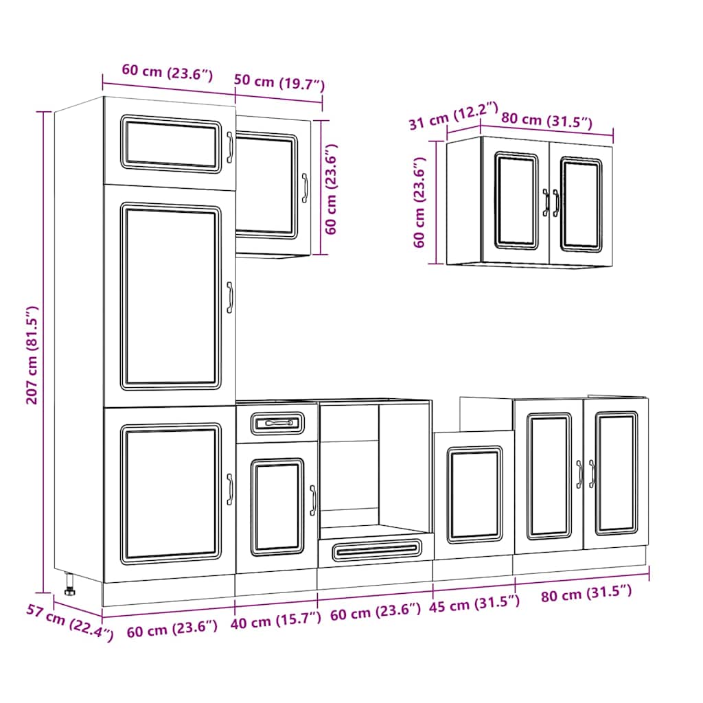 Dette køkkenskabssæt i 7 dele har et enkelt design, og de optimerer din køkkenplads og giver rigelig med opbevaringsplads til dit køkkenudstyr!
