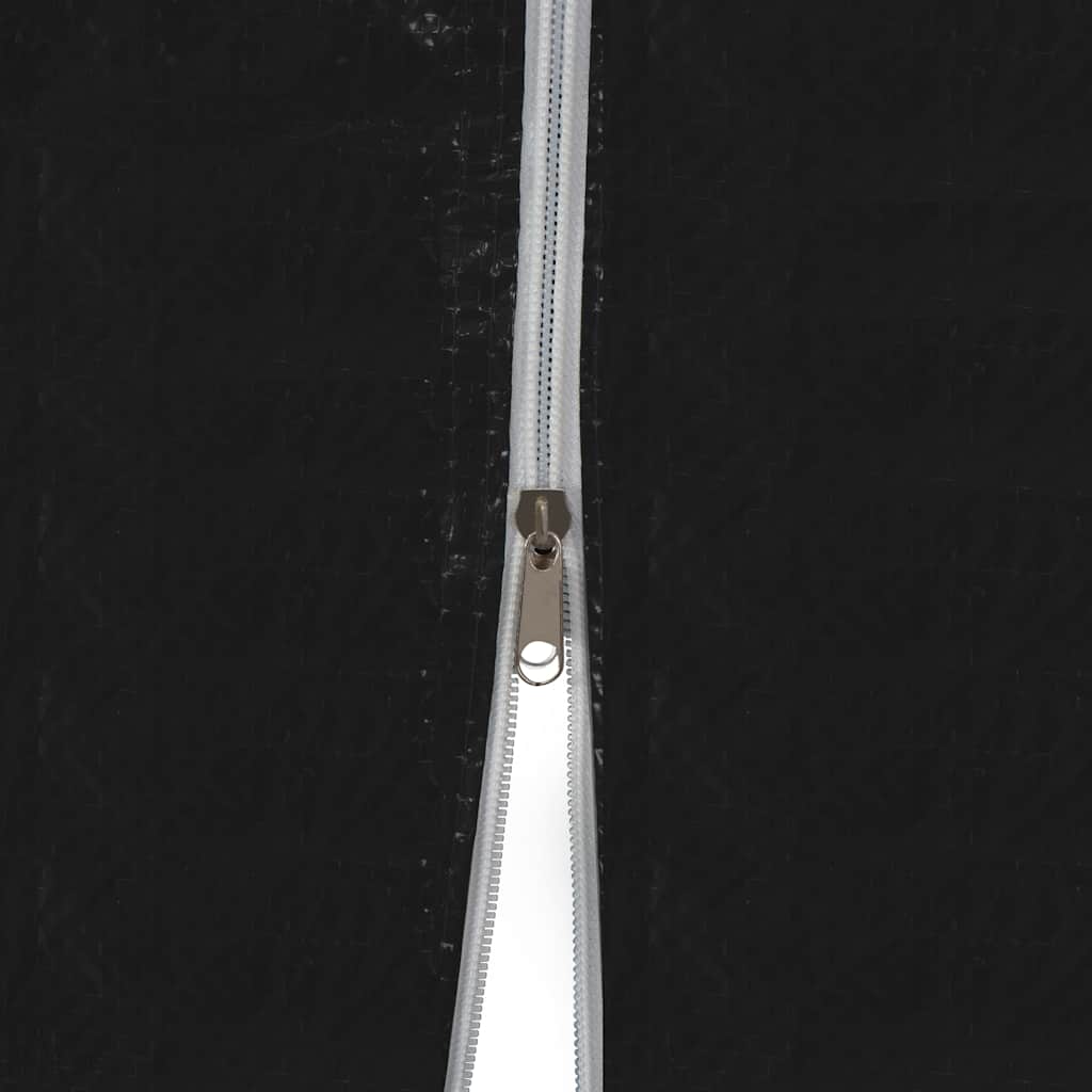 - Materiale: PE-tag og sidepaneler i stof + stålstel