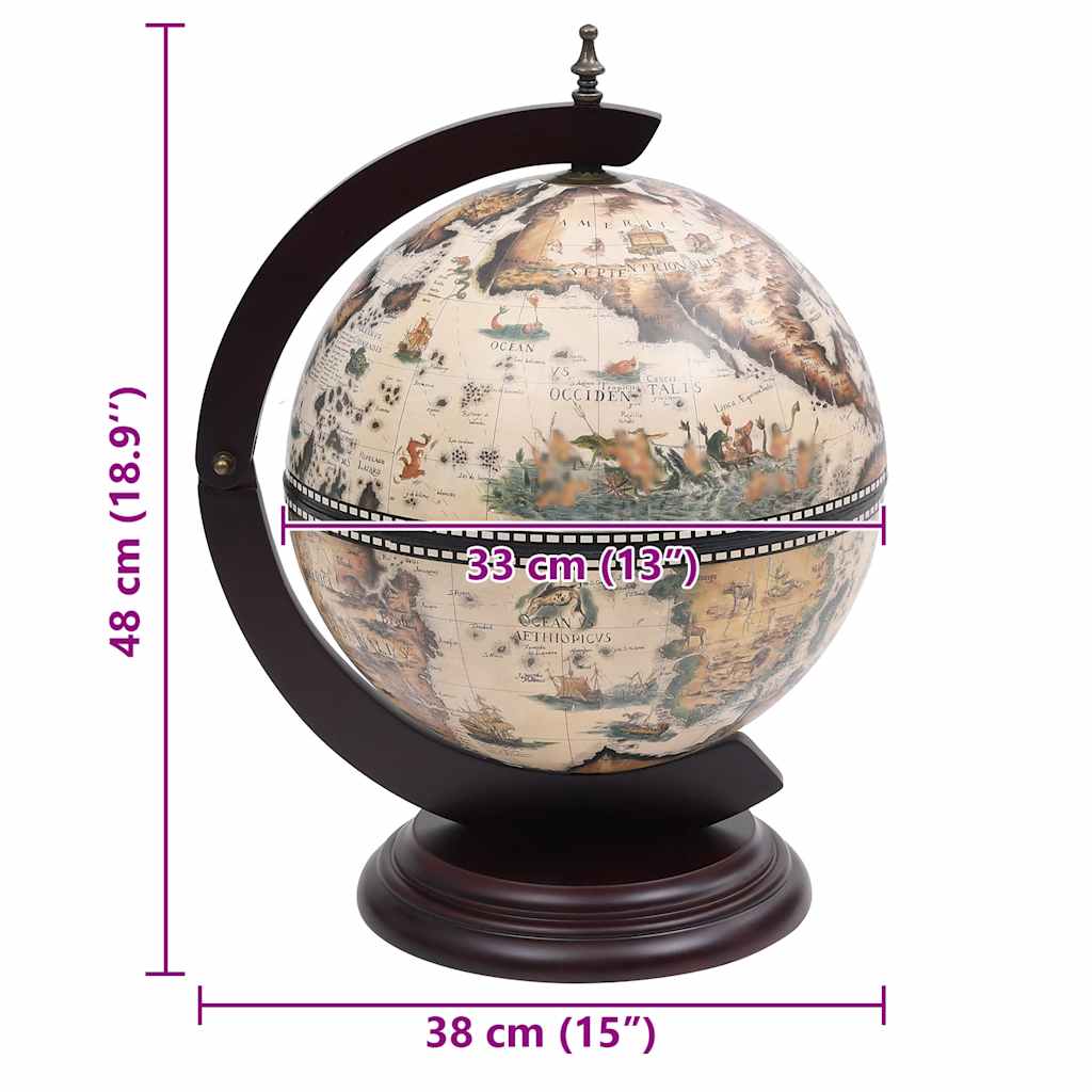 Ydersiden af globussen er udsmykket med replikaer af gamle søkort fra det 16. århundrede, mens bordet, bundpladen og indersiden af kloden er dekoreret med renæssancemalerier, hvilket gør globusbarskabet til et kunstværk og en god dekoration til hjemmet eller kontoret.