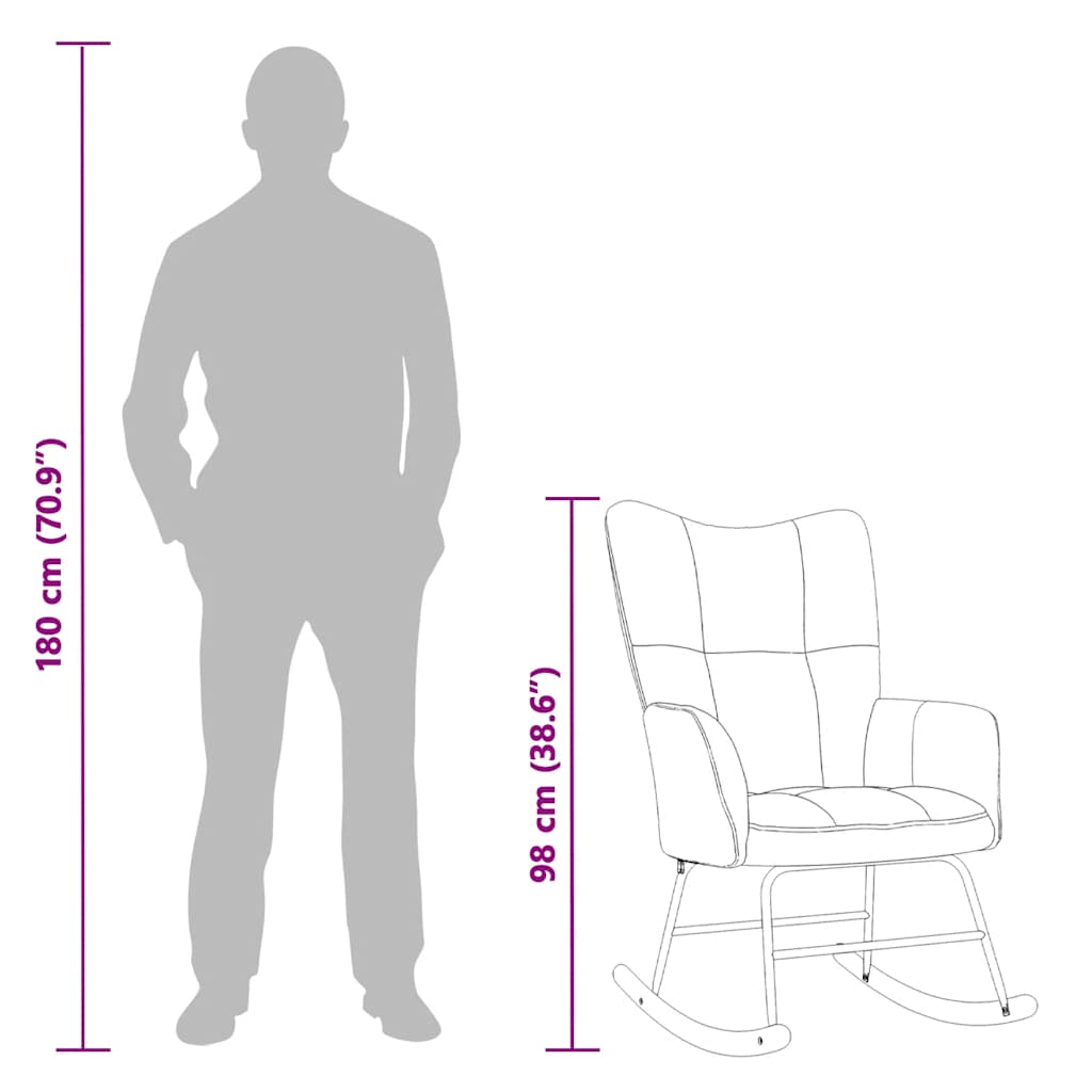 Gyngestolen har et attraktivt design med sine blokformede syninger. Takket være skumpolstringen, der er betrukket med blødt fløjl, kan du nyde optimal komfort, når du sidder i stolen. Med gyngeskinnernes lange design vælter lænestolen ikke let. Derudover er stolen understøttet af stålstel og -ben sammen med gyngeskinner af træ, så den er stabil og holdbar.