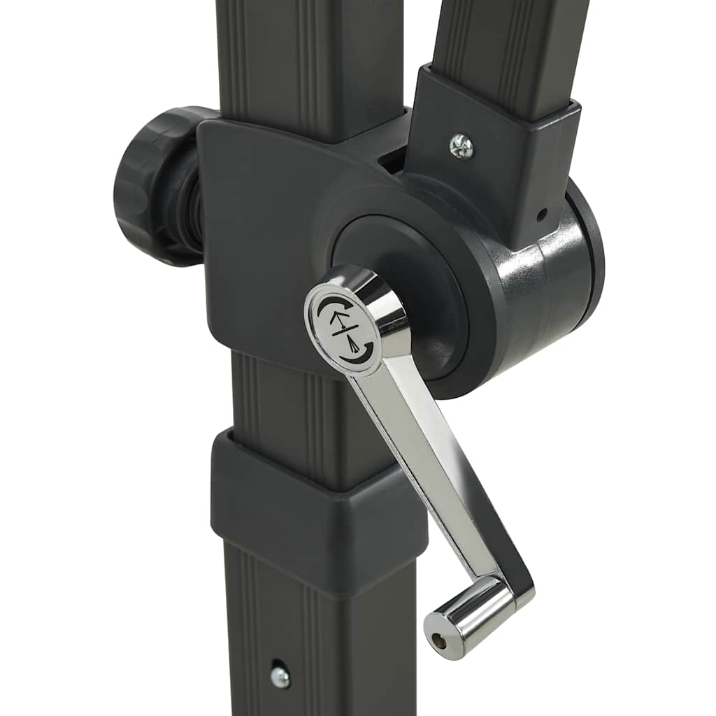 Parasoldugen, der er fremstillet af UV-beskyttende og falmefri polyester, giver dig optimal beskyttelse mod solen og er let at rengøre. Det er udstyret med en robust krydsfod for ekstra stabilitet. Haveparasollens eksklusive design giver dig mulighed for at vippe og dreje den 360 grader for at blokere solen fra enhver vinkel. Den stærke aluminiumsstang sammen med de 8 ribber gør parasollen meget stabil og holdbar. Denne haveparasol kan nemt åbnes og lukkes takket være håndsvingsmekanismen. Derudover har denne terrasseparasol 24 LED'er, der oplyser dit uderum og skaber en hyggelig og romantisk stemning, når solen går ned.
