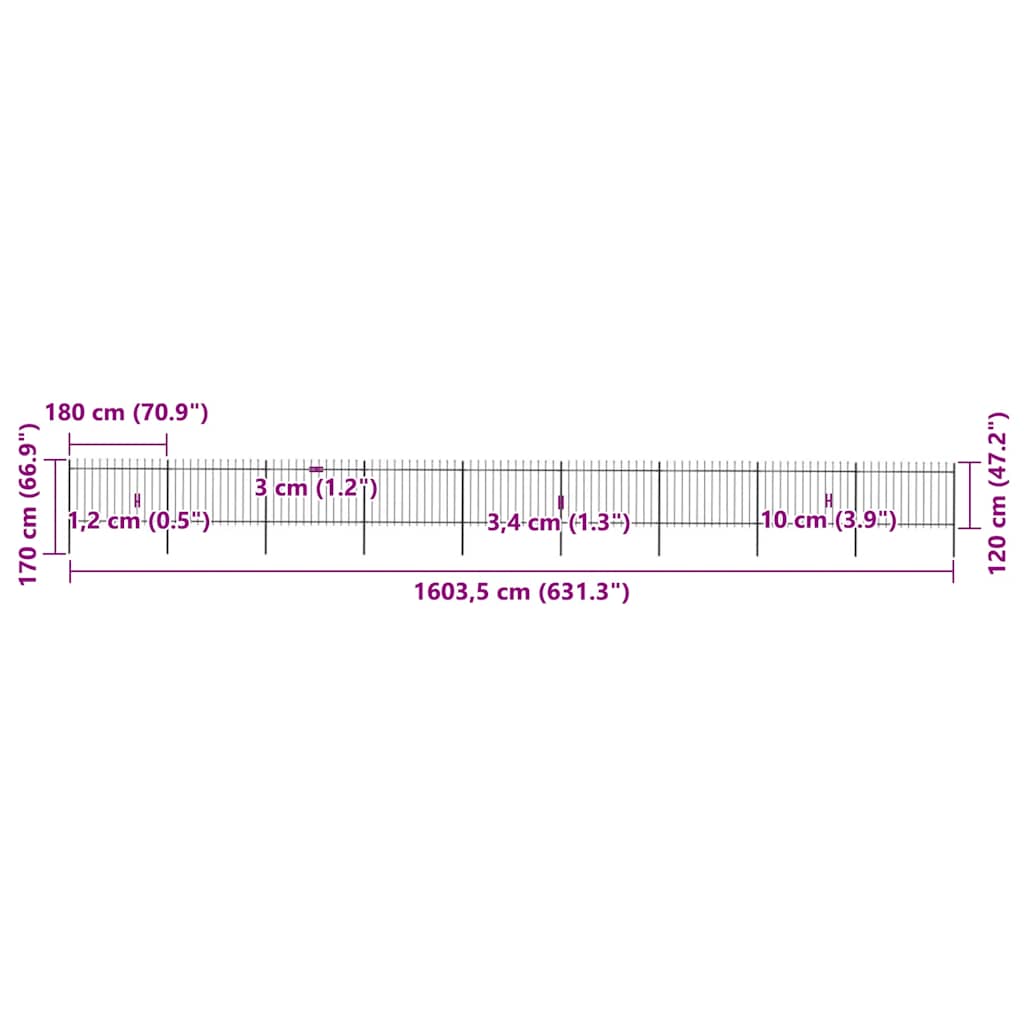 Lav et elegant hegn rundt om din have, dit hjem eller gangsti med vores havehegn! Vores dekorative hegn i stål, som består af 9 hegnspaneler og 10 stolper, har en samlet længde på 15,3 meter. Det vil danne en robust, sikker og vedligeholdelsesfri afskærmning til din have, dit hjem eller erhvervsejendom.