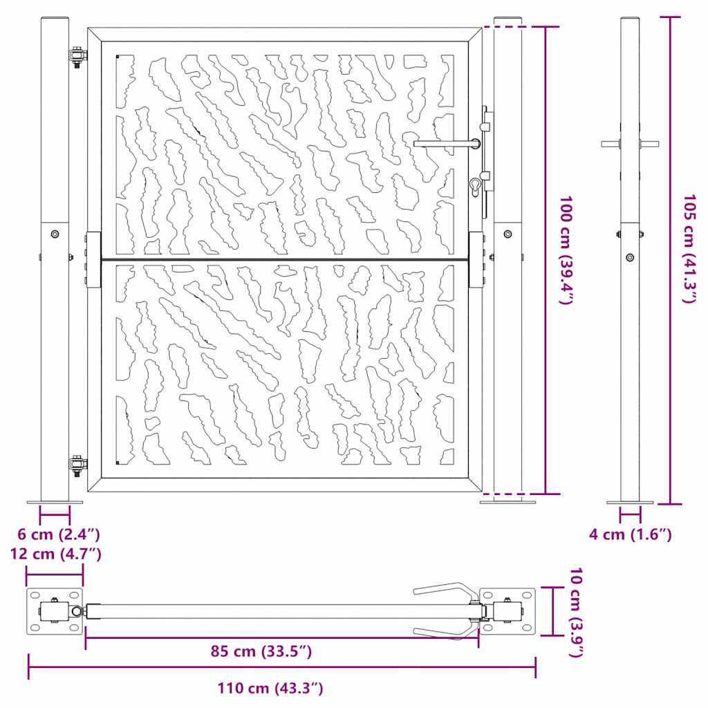 - Kraftig konstruktion: Denne hegnslåge er lavet af vejrbestandigt stål. Forvitringsstål er korrosionsbeskyttende i kraft af sin natur. Det udvikler et rustent beskyttelseslag mod korrosion, når det først udsættes for atmosfæriske forhold. Derfor behøver du ikke at male det. Det kan hjælpe dig med at spare på vedligeholdelses- og reparationsomkostningerne. Den karakteristiske brune farve på forvitringsstålet vil helt sikkert være et blikfang. Endelig er forvitringsstål usædvanligt holdbart og vil kunne klare tidens tand.