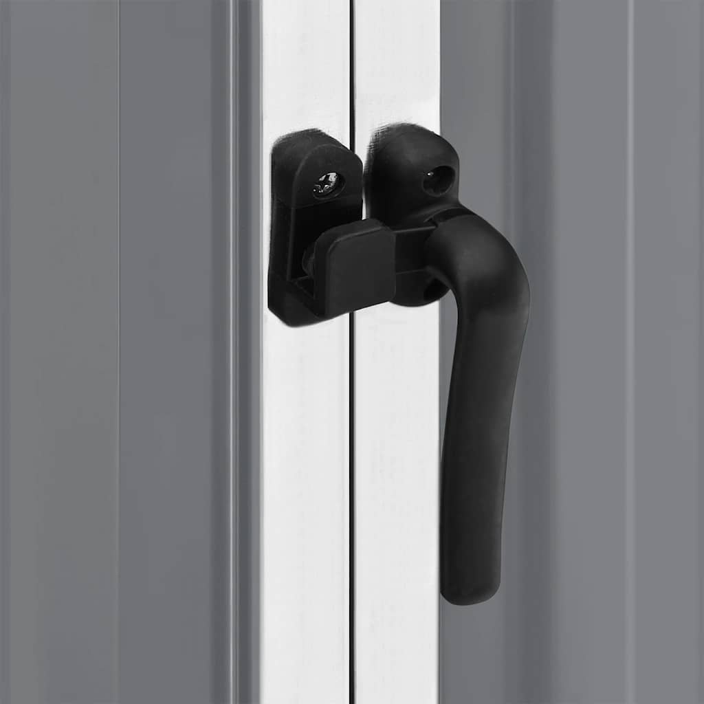 Dette opbevaringsskur til udendørsbrug er fremstillet af galvaniseret stål, og det kræver ikke meget vedligeholdelse, samtidig med at det er yderst slidstærkt. De dobbelte døre foran giver nem indgang og udgang. Regnvand løber automatisk af taget takket være det skrå design.