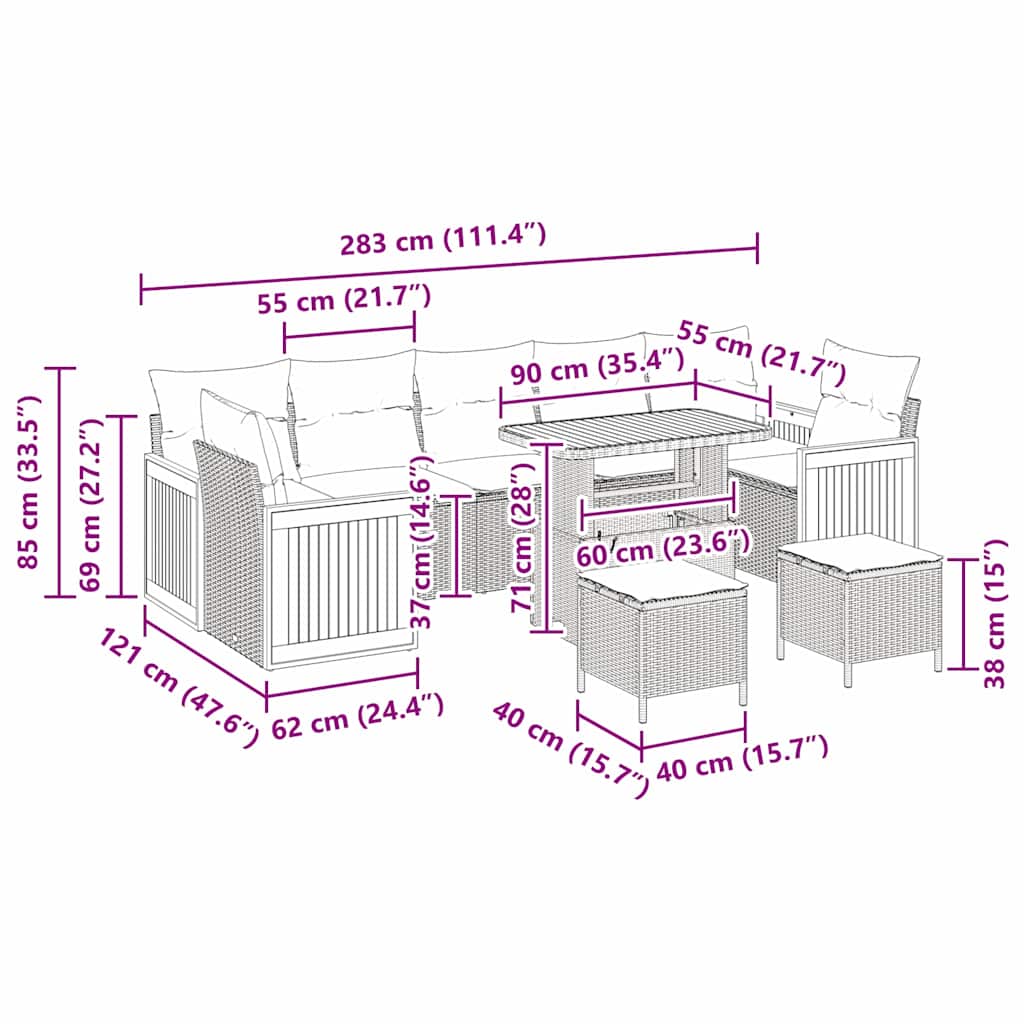 - Funktionelle Komponenter: Med indbygget opbevaring har sættet armsofaer, centerpladser og taburetter, alle med praktisk opbevaring under. Denne smarte funktion hjælper med at holde dit udendørsområde ryddeligt og gør brugen nemmere.