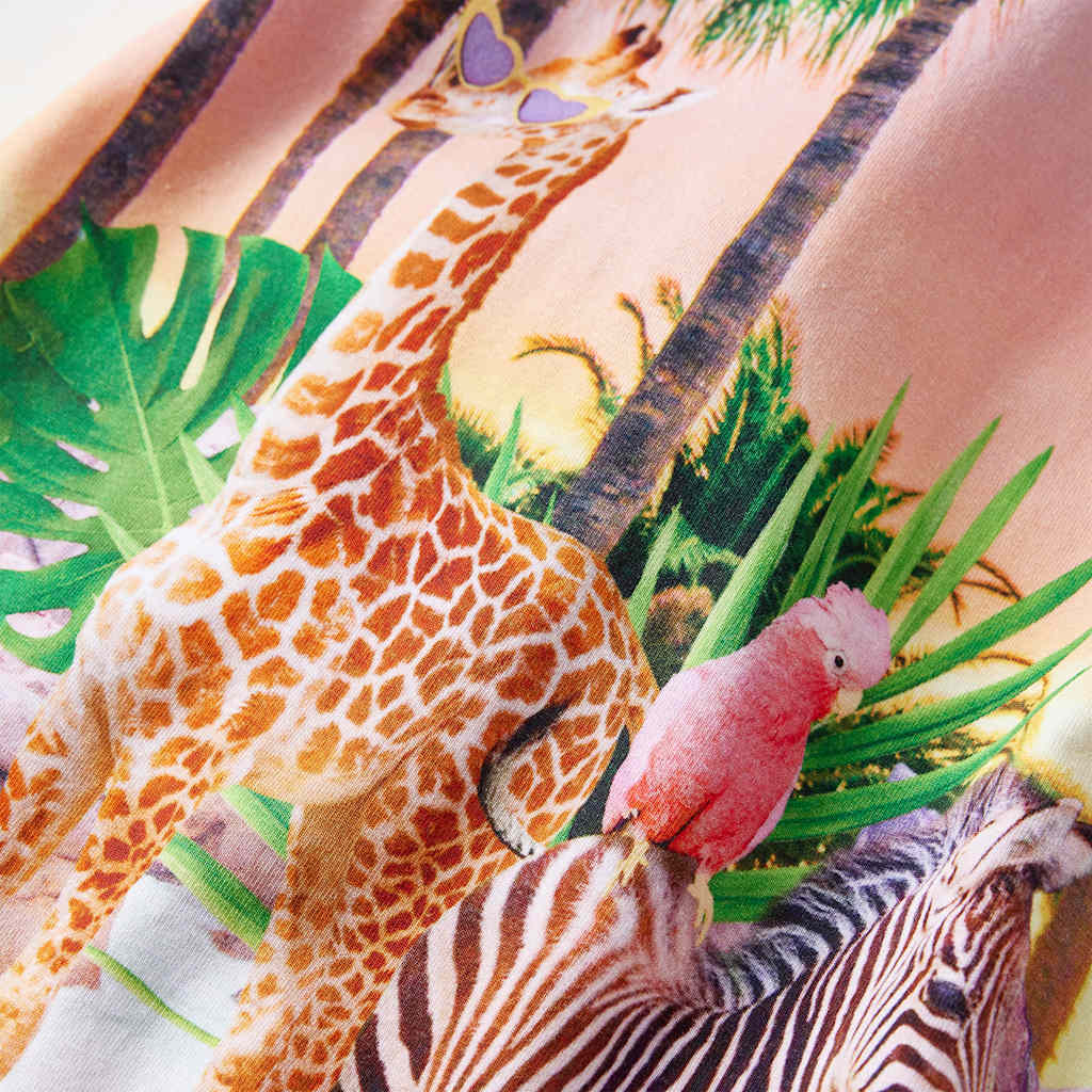 Denne kjole til børn har ingen ærmer, en rund halsudskæring og lukkes med en usynlig lynlås bagpå. Den koralfarvede kjole har et tropisk landskab og dyr foran. Den har snore bagpå, der kan være med til at skabe en subtil talje, uden at den sidder for stramt. Kjolen er fremstillet af et blødt materiale, der inkluderer bomuld og elastan, hvilket giver komfort og åndbarhed.