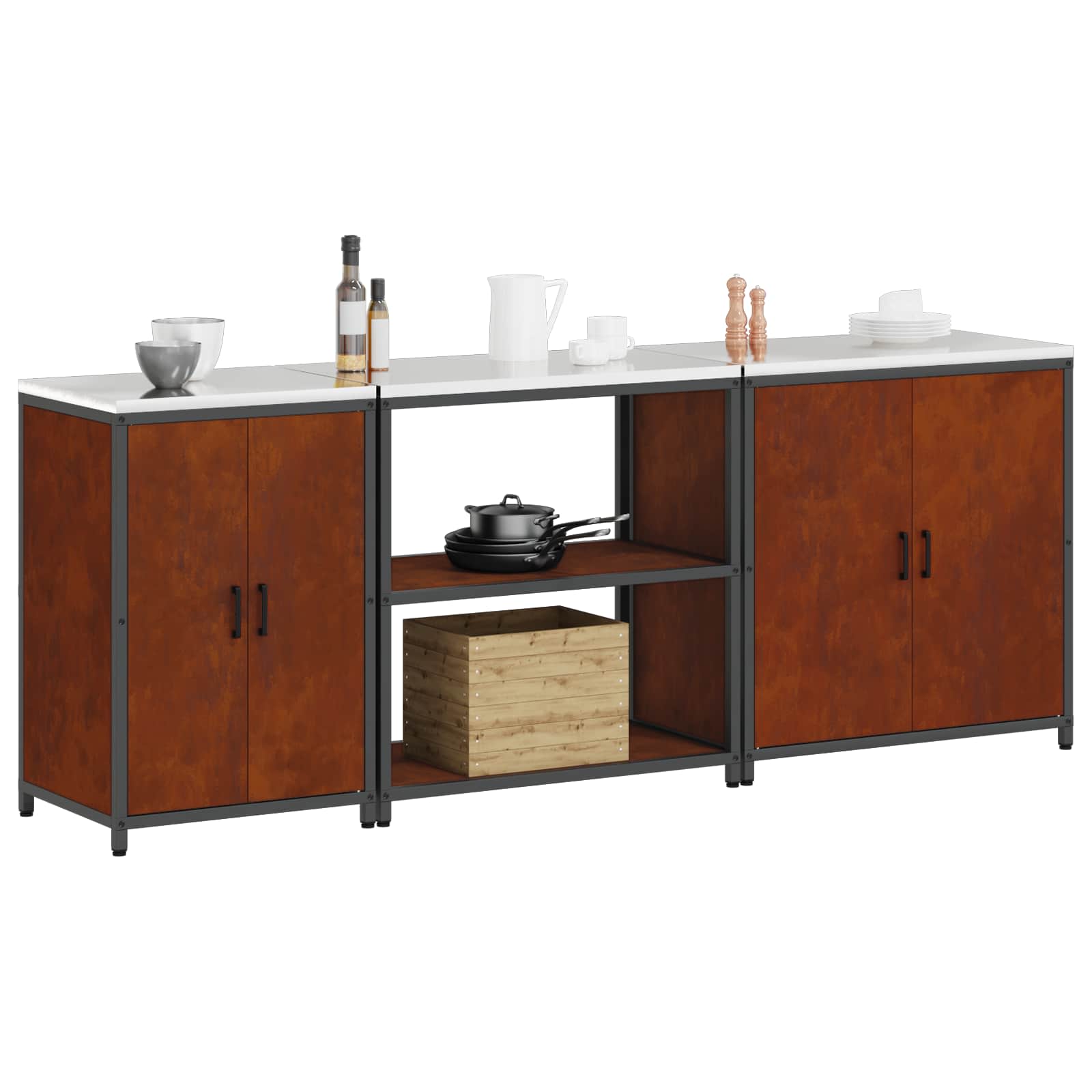 - Inkluderede komponenter: Skabet har flere hylder og rum, der hver især er designet til forskellige opbevaringsbehov—ligegyldigt om det er gryder, pander eller madvarer. De stålhylderne sikrer stabilitet og kan holde til tunge genstande, mens stålrammen og -benene giver ekstra støtte. Skabsdørene lukker stærkt og sikkert.