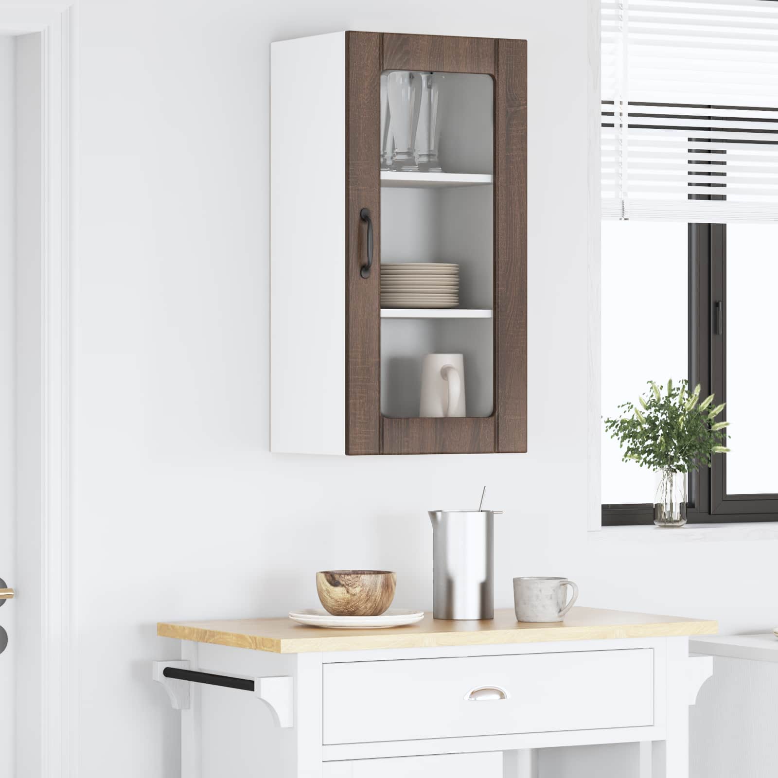 Det her træ-køkkenskab er designet med moderne stil og slanker det hele i dit køkken. Det robuste konstruerede træ sikrer, at det holder længe. Skabet tilføjer elegance med sine rene linjer og minimalistiske look. Det giver dig masser af opbevaringsplads med gennemtænkte rum og hylder. Uanset om det er til tallerkener eller pantryvarer, passer det perfekt ind i moderne køkkener og gør dit madlavningsområde mere funktionelt.
